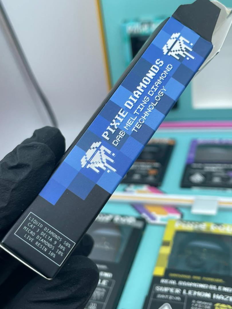 The “Pixie Diamonds” or “Real Wax Diamond” language refers to the concentrate containing THCa diamonds (a very high-potency form of cannabis concentrate) plus other cannabinoids and terpenes.